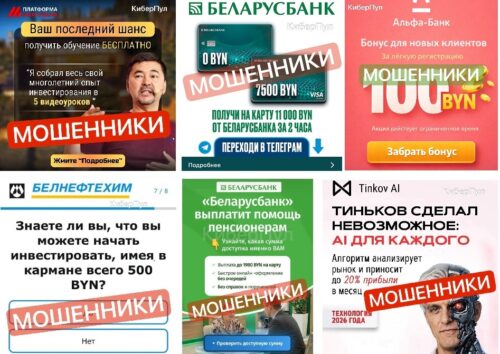 Актуальная подборка фишинговой рекламы,которой белорусов заманивают на фейковые инвестплатформы, предлагают пройти курсы по трейдингу чтобы быстро разбогатеть или просто пройти опрос за бонус.